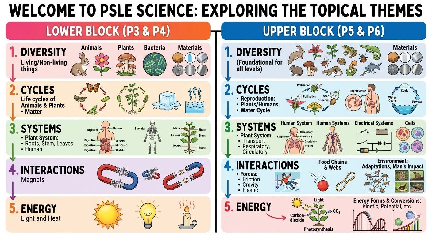 Your child’s entire PSLE Science content is here. The syllabus progresses from Lower Block (P3/P4) to Upper Block (P5/P6) across 5 numbered, interconnected themes that build in complexity: