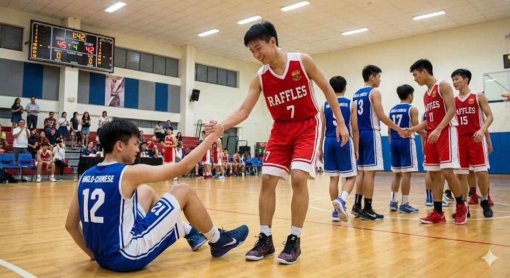 Theme: Sportsmanship / Handling Defeat / Resilience Visual Stimulus: A photo inside a school sports hall. A basketball match has just ended. The players in the blue jerseys look disappointed, with one boy looking down at the floor. However, the captain of the winning team (in red) is reaching out his hand to help the boy in blue up, and both are sharing a respectful smile.