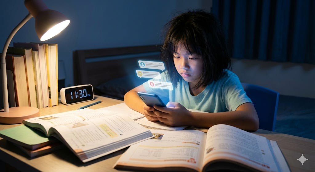 Theme: Cyber Wellness / Screen Time / Digital Distractions Visual Stimulus: A photo of a student sitting at a study desk late at night. The student’s textbooks are open, but they are looking at their smartphone with a stressed and tired expression. Several notification bubbles are popping up on the screen.