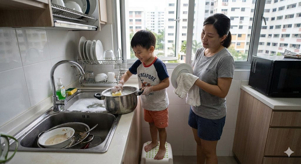 Theme: Household Chores / Independence / Taking Responsibility Visual Stimulus: A photo taken in an HDB kitchen. A primary school boy is standing on a small step stool, smiling as he washes the dinner plates with soapy water in the sink. His mother is standing beside him, drying a cup with a towel and looking at him proudly.