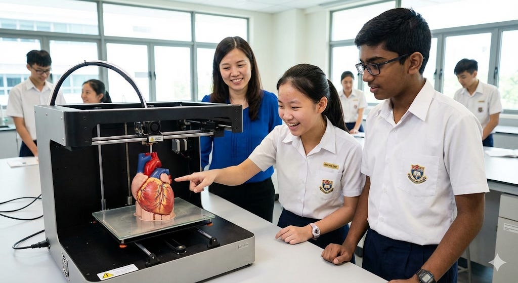 Theme: Technology in Education / Hands-on Learning Visual Stimulus: A photo of Singaporean secondary school students in their white uniforms in a science lab. A Chinese girl is pointing excitedly at a large 3D printer, which is printing a detailed, realistic model of a human heart. Beside her, an Indian boy looks on with a fascinated smile. A teacher stands in the background, observing them proudly.