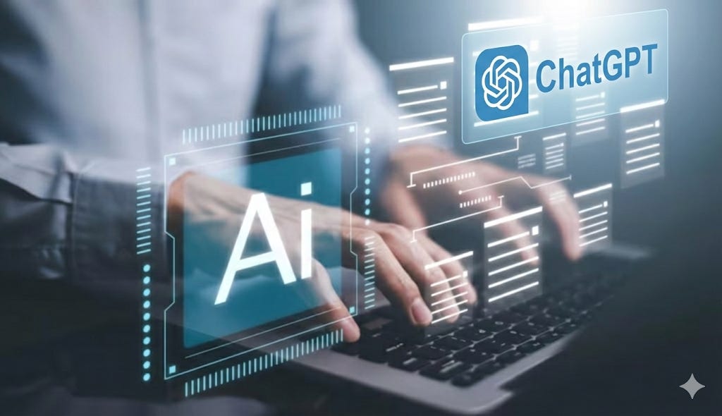 Theme: Digital Literacy / Artificial Intelligence / Academic Integrity Visual Stimulus: The uploaded image showing a person typing on a laptop keyboard, with glowing holographic overlays of the letters “Ai”, document icons, and the blue “ChatGPT” logo floating above the screen.