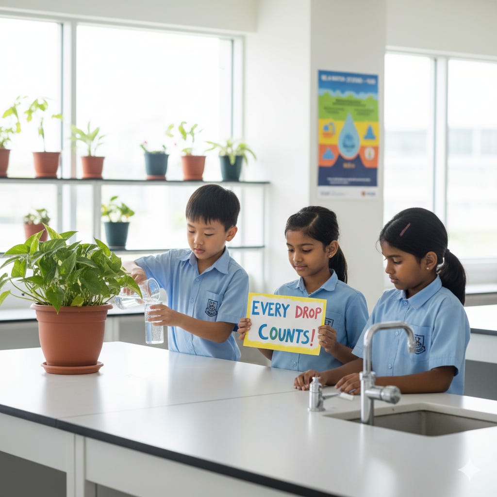 Theme: Environmental Protection / Water Conservation Visual Stimulus: A bright, clean photo of a student in a school uniform, standing at a sink in a science lab. He is carefully pouring leftover water from a beaker into a plant pot, rather than down the drain. There are other plants on a nearby shelf.